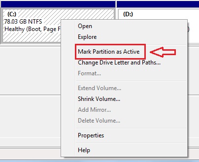 در صورت باز شدنِ پنجره پایین روی درایوِ ویندوز از هارد جدیدتان راست کلیک کرده و Mark Partition as Active را انتخاب کنید. دقت کنید! روی درایور C هاردِ همین کامپیوتر کلیک نکنید. (این تصویر برای نشان دادنِ کلیک و انتخاب گزینه مناسب می باشد)