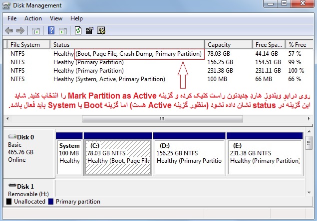شما می توانید یک سی دی ویندوز درون دی وی دی درایوتان قرار دهید و از طریق دی وی دی درایو سیستم را بوت کنید و وارد محیط ویندوز شوید. سپس از طریق Disk Management و راست کلیک کردن روی درایو C و انتخاب گزینه Mark Partition as Active ، درایو C را به حالت Active دربیاورید. رویِ یک هارد حتما باید یک درایو (که اکثراً درایو ویندوز یعنی C) هست، به حالت فعال باشد تا سیستم بتواند درایو ویندوز را شناسایی کند. دی وی دی ویندوز را از دی وی دی درایو خارج کنید و سیستم را ریستارت کنید.