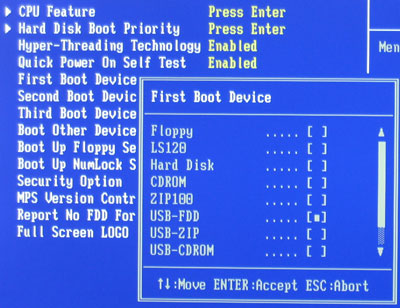 First Boot Device را روی CD-ROM قرار دهید و Second Boot Device را روی Hard Disk قرار دهید.