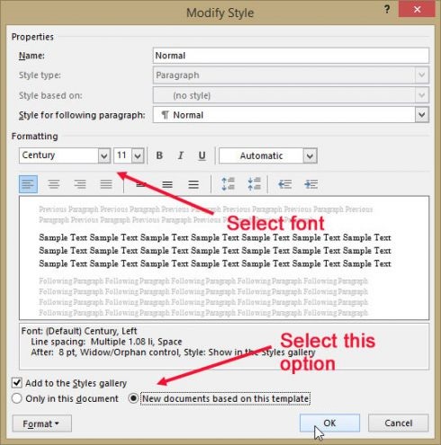 2. در پنجره Modify فونت خود را در قسمت Formatting انتخاب کنید. تیک گزینه New documents based on this template را بزنید.