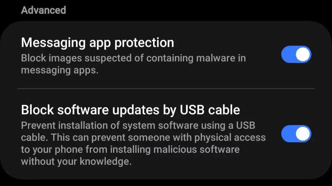 دستگاههای گلکسی سامسونگ دارای قابلیت مسدودسازی خودکار هستند که گوشی شما را از تهدیدات خارجی محافظت میکند. این قابلیت از نصب اپلیکیشنها از منابع غیرمعتبر جلوگیری کرده و اگر تصاویری حاوی بدافزار از طریق اپلیکیشنهای پیامرسان دریافت کنید، به شما هشدار میدهد. همچنین این قابلیت از دستکاری گوشی شما توسط دیگر دستگاهها هنگام اتصال از طریق کابل USB جلوگیری میکند.