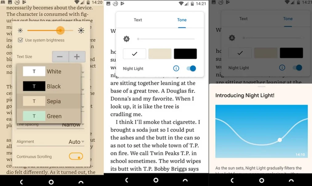 بسیاری از اپلیکیشن‌های کتاب‌خوان مانند Google Play Books این امکان را دارند که متن سفید را روی پس‌زمینه سیاه نمایش دهند که می‌تواند خستگی چشم را کاهش دهد. Google Play Books علاوه بر این، قابلیت نور شب را دارد. این ویژگی به‌طور خودکار در غروب آفتاب فعال می‌شود و به تدریج نور آبی بیشتری را از صفحه نمایش حذف می‌کند.