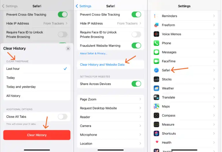 3. پس از انتخاب Safari، دوباره به پایین اسکرول کنید تا به گزینه "Clear History and Website Data" برسید.