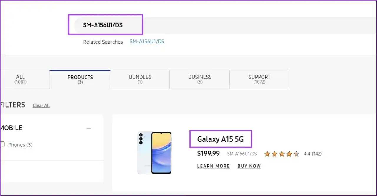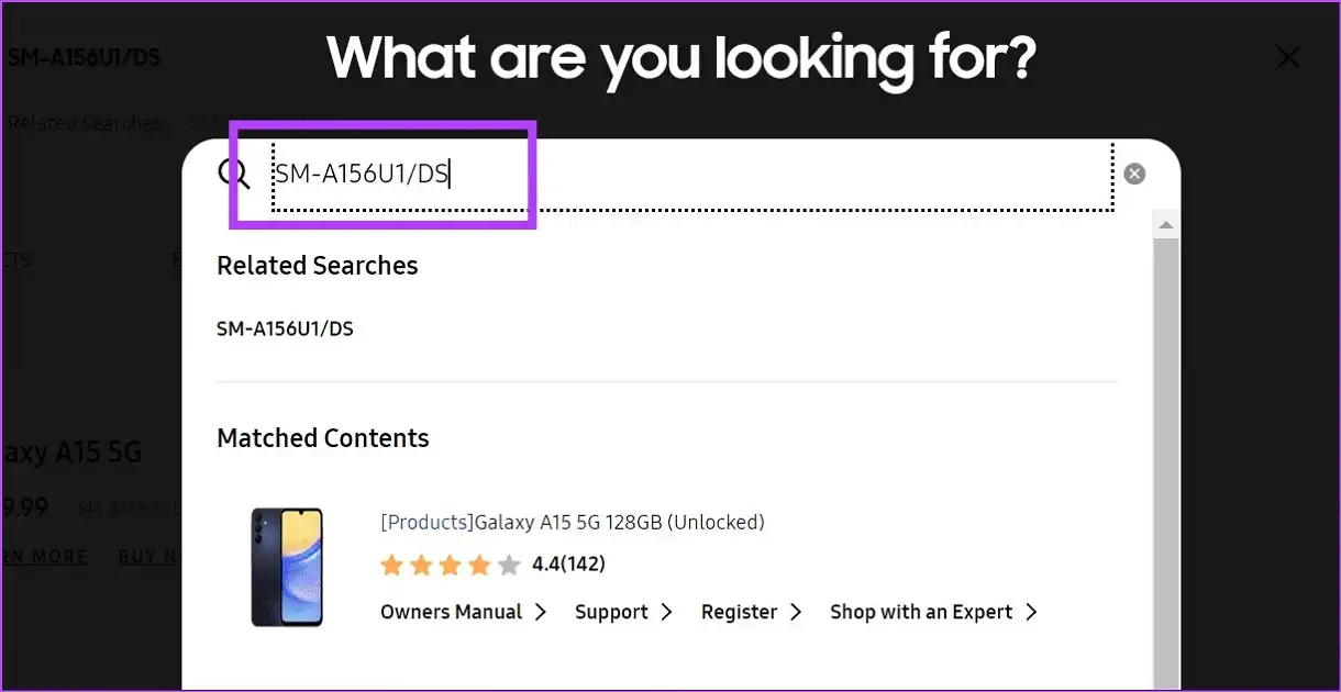 مرحله سوم: به وبسایت سامسونگ رفته و شماره مدل را جستجو کنید.