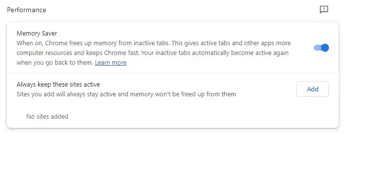 چگونه؟ از منو به تنظیمات بروید، گزینه Performance را انتخاب کرده و حالت Memory Saving mode را فعال کنید. سپس با استفاده از گزینه Always keep these websites active میتوانید صفحاتی را مشخص کنید که نمیخواهید متوقف شوند.