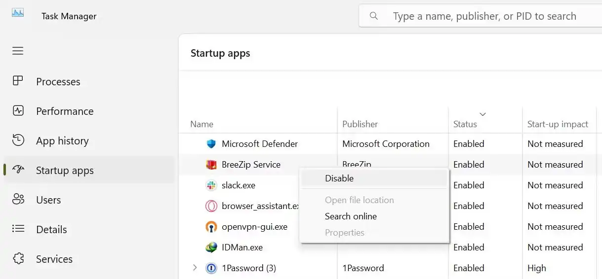 ۳. برنامههای غیرضروری را انتخاب و با کلیک راست گزینه Disable را فعال کنید.