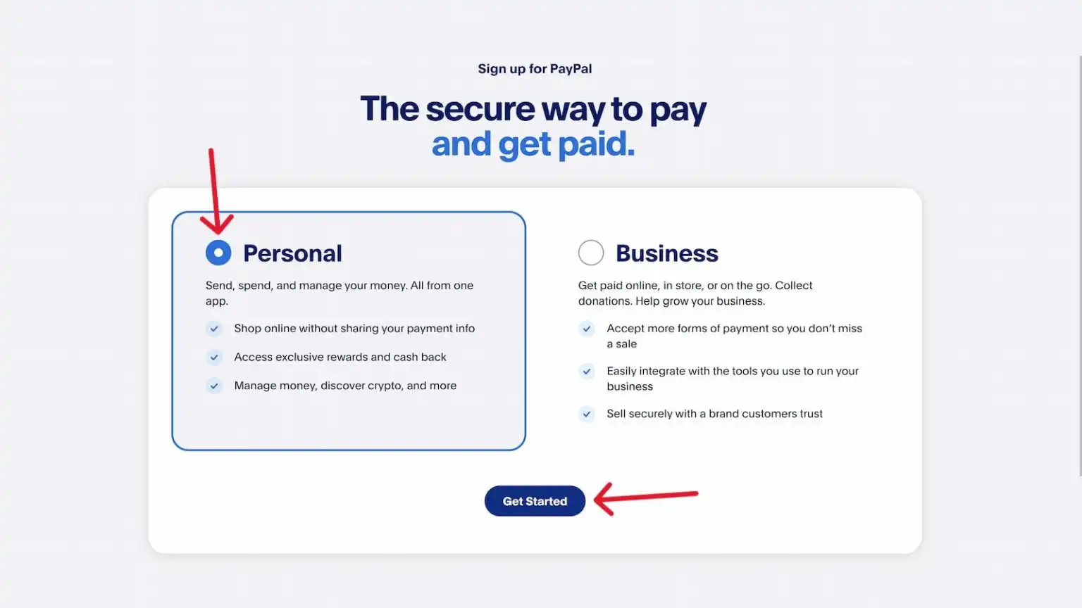 گزینه Personal را انتخاب کرده و Get started را بزنید.