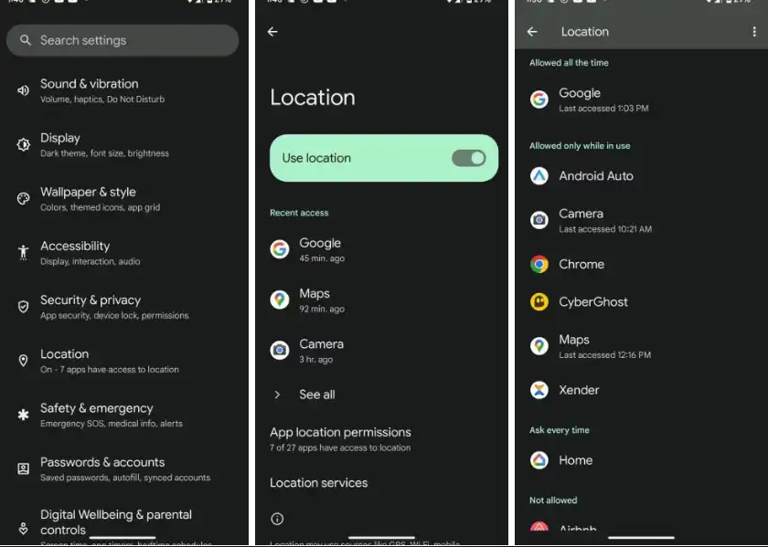همچنین میتوانید از مسیر Settings > Location برنامههایی را که اخیراً به موقعیت مکانی دسترسی داشتهاند مشاهده کنید.