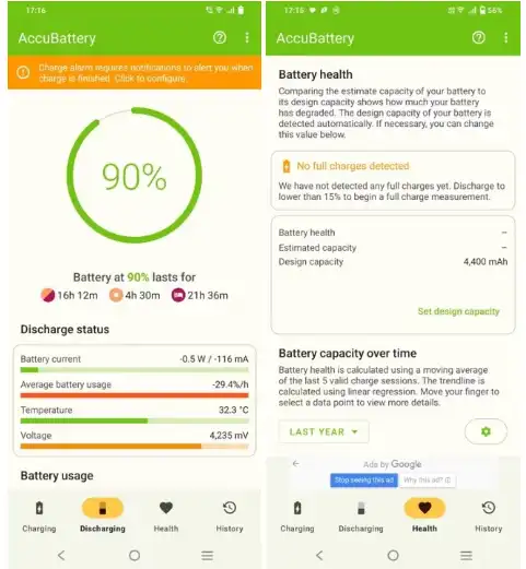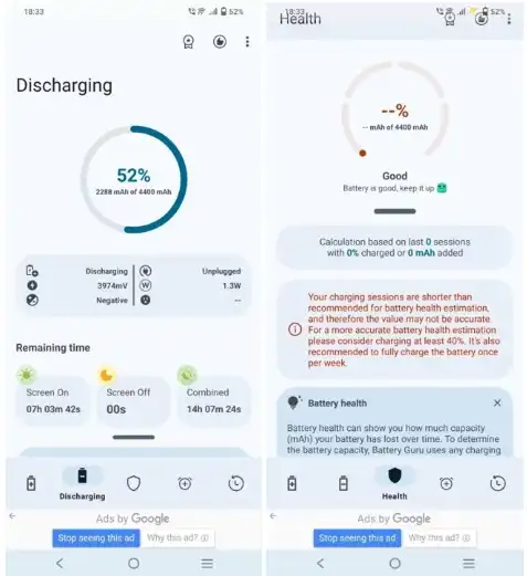 Battery Guru برنامه‌ای رایگان است که سلامت باتری، سرعت شارژ و ظرفیت آن را بررسی می‌کند. همچنین می‌توانید هشدارهایی برای نظارت بر سطح باتری و دما تنظیم کنید. نسخه پولی این برنامه نیز بدون تبلیغات ارائه می‌شود.