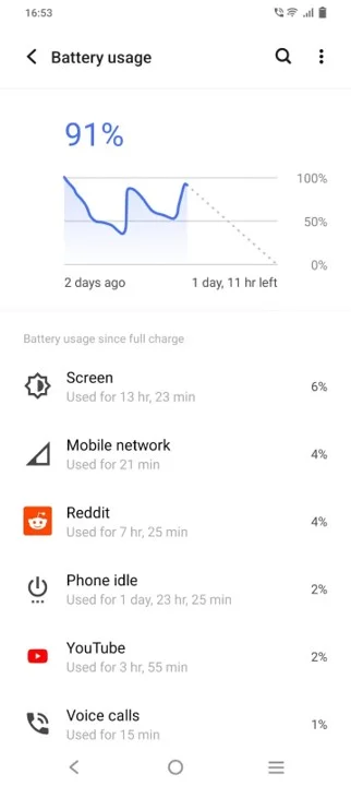 ۴. در این بخش، می‌توانید میزان مصرف باتری از زمان آخرین شارژ کامل را مشاهده کنید و بفهمید که کدام برنامه‌ها بیشترین مصرف باتری را دارند.