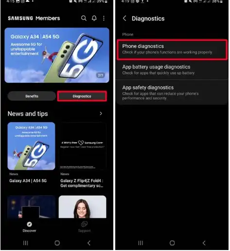 برای گوشی‌های سامسونگ، اپلیکیشن Samsung Members دارای منوی عیب‌یابی است که عملکرد دستگاه را بررسی می‌کند. این اپلیکیشن به صورت پیش‌فرض روی بیشتر گوشی‌های سامسونگ نصب است. اگر این برنامه را ندارید، می‌توانید از گوگل پلی یا گلکسی استور دانلود کنید.