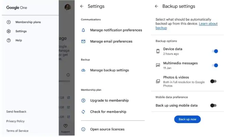 گوگل وان امکان بازیابی اطلاعاتی مانند تنظیمات دستگاه، پیامها، مخاطبین و رمزهای عبور را فراهم میکند. برنامه گوگل وان را در گوشی قدیمی نصب کرده و به مسیر Settings > Manage backup settings بروید. پس از فعال کردن گزینههای موردنظر، روی Backup now کلیک کنید.