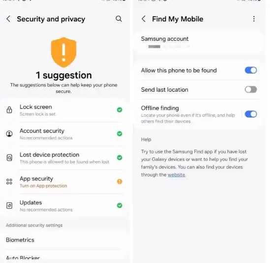 همچنین می‌توانید با مراجعه به Settings > Security and privacy > Lost device protection بررسی کنید که آیا گوشی گلکسی شما از قابلیت ردیابی آفلاین پشتیبانی می‌کند یا خیر.