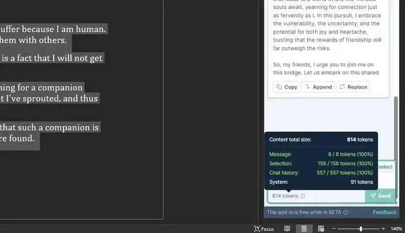 پس از دریافت پاسخ، افزونه به شما این امکان را میدهد که پاسخ را در زیر متن انتخابی جاسازی (Embed) کنید یا بخش انتخابشده را با پاسخ ChatGPT جایگزین (Replace) کنید. همچنین در زیر کادر درخواست، تعداد توکنهای استفادهشده نمایش داده میشود. از آنجا که ChatGPT از کل مکالمه بهعنوان زمینه استفاده میکند، بهتر است مکالمههای قدیمی را بازنشانی کنید تا از حد مجاز توکن فراتر نروید.