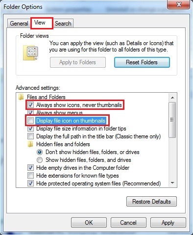 در پنجره باز شده روی برگ نشانِ View کلیک کنید و تیک گزینه Display file icon on thumbnails را بردارید. گزینه Always show Icons, never thumbnail را تیک دار کنید. (این مرحله باعث میشود شما دیگر آیکون های موجود در صفحه دسکتاپ یا فولدر ها را به صورت کاشی نبینید!!!)