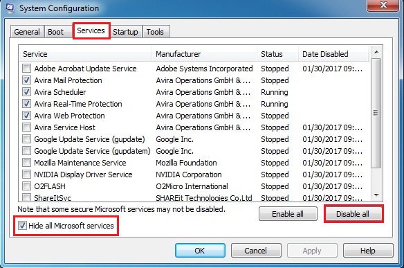 تیک گزینه Hide all Microsoft services را بزنید، سپس روی دکمه Disable all کلیک کنید. Apply را بزنید و روی دکمه Ok کلیک کنید.