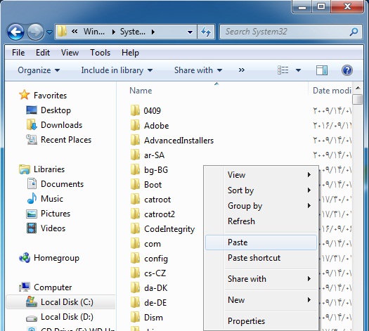 در مسیر درایو C و وارد فولدر WINDOWS و در زیرفولدر SYSTEM32 ، پِیست (Paste) کنید (بچسبانید).