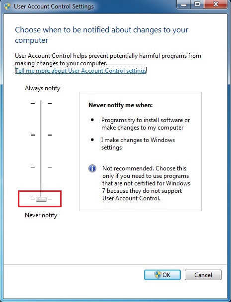 در صفحه باز شده میله عمودی را تا انتها پایین بیاورید. Ok را بزنید. ما سطح امنیتی را در پایینترین حالت قرار میدهیم. (disable UAC temporarily) امنیت ویندوز اون چیزی نیست که شما فکر میکنید. این گزینه فقط پیغام اجازه دادن به نصب نرم افزار رو از بین میبره وگرنه هیچ کاربرد دیگه ایی نداره.